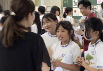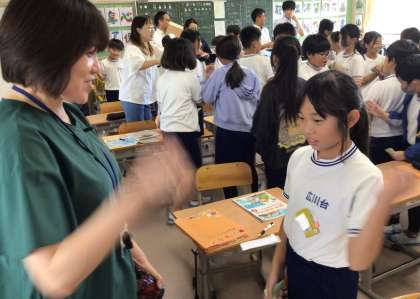 先生たちにも、どんどん声をかけて、じゃんけん、英語で質問をする1組のみんなでした。