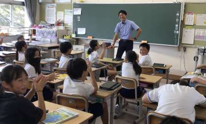 5年2組の担任の先生は、本校の英語主任の先生なので、1組で授業の様子を見守っています。
