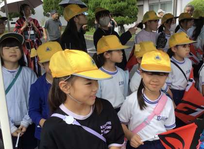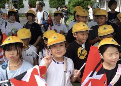 グランドの安全なエリアに見学場所を作ってもらい、全校で見守ります。