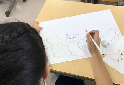 個性的なネコの絵を描こうと、表情や手足の動きを工夫していました。