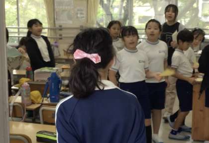 白い買い物カゴを持っている子たちが各クラスを回ってくれています。