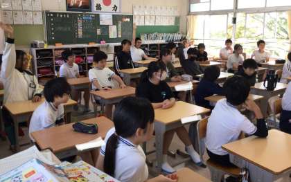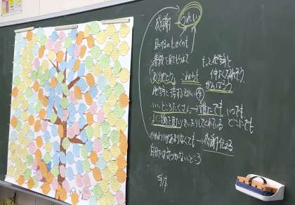 集まった紙を見て、みんなで意見を出し合う6年2組さん。