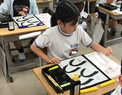 ひらがなの「つ」という字を練習中の3年2組さん。