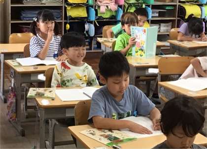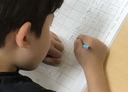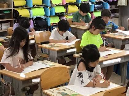 1年2組さん、書写の授業で「おにいさん」「おねえさん」などの平仮名を練習中です。