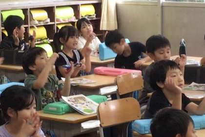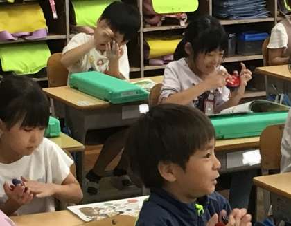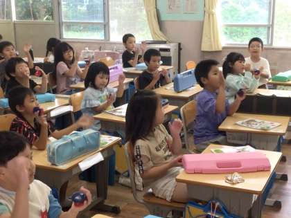 1年1組さん、音楽の授業でカスタネットを使って演奏中です。