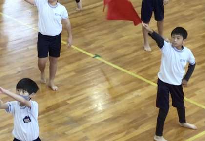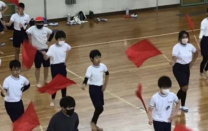 音楽に合わせて旗を振って踊ります。
