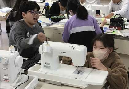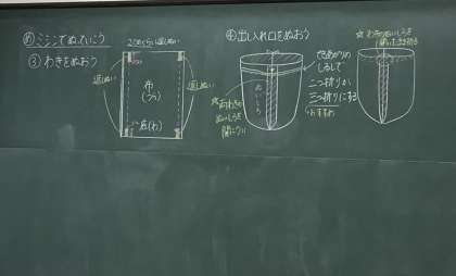 今日は家庭科の先生+担任の先生も助っ人で参加をして、袋作りに取り組む6年1組のみんなです。