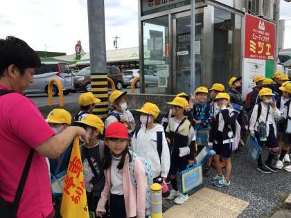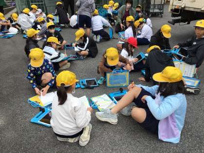お店の見学を終えて、メモをタブレットでまとめ、安全に気をつけて、学校に戻ります。