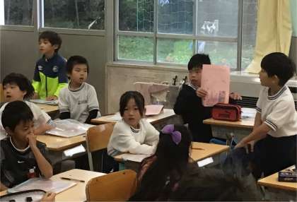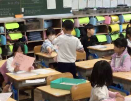 1年1組さん、朝の会の時間に「運動会のしおり」が配られていました。