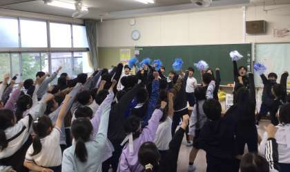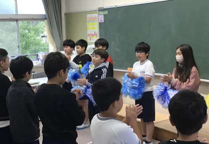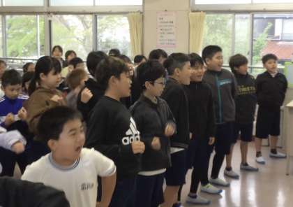 3・4年生の子たちが赤白分かれて、4年1組、2組に入って応援の練習をしていました。