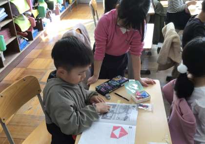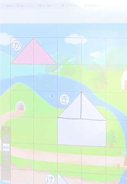 先生がスクリーンに写してくれた形と同じものを算数セットの道具を使って、作ってみます。