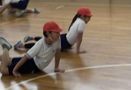 先頭の子がスキップしたり、ハイハイみたいなことをしたり、ほふく前進をしたりします。