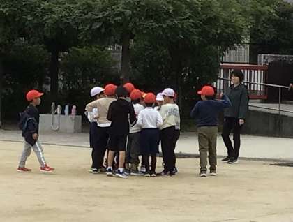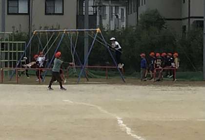 ブランコには行列ができ、4年生は男女混合で大鬼ごっこ大会、3年生はドッチボールのチーム決めです。