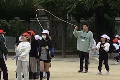 ALTの先生と縄跳び練習する子たち、サッカーをする1年生、ジャングルジムで遊ぶ子たち、いつもよりたくさん時間があるので、遊びを満喫しています。