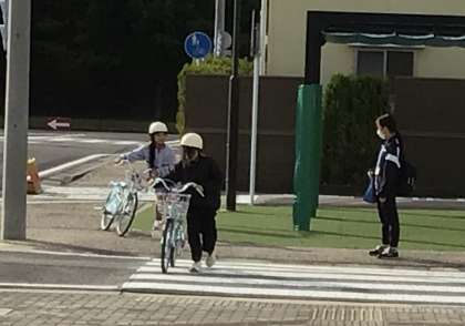 横断歩道を渡る時は、自転車から降りて、左右の確認をします。