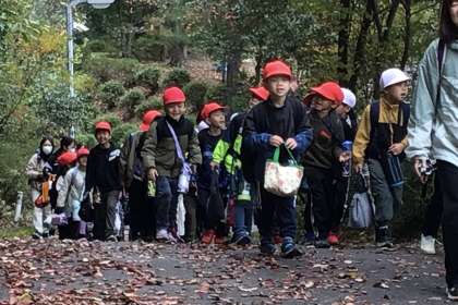 1年1組さん、バスを降りてトヨタの森の施設に歩いて登ってきました。