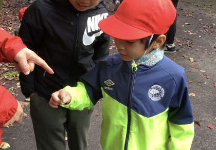 建物近くの落ち葉で遊んだり、ある子が見つけたカメムシを手に取ってみたりしました。