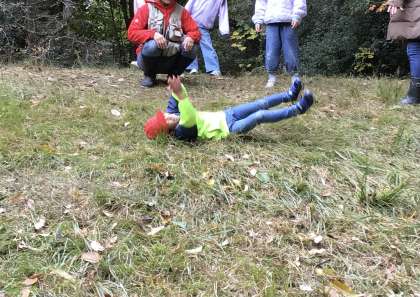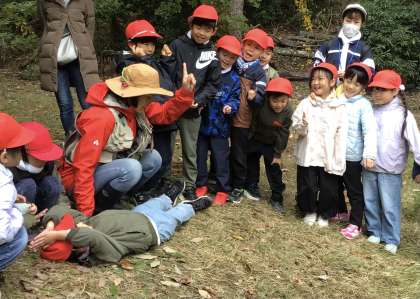1年生 トヨタの森の様子です 公開日 2025/11/12 更新日 2025/11/12 校長室から 坂を横向きでグルグル転がる遊びをやってみました。 最初にやり方を教えてもらって、他の子がどんどんチャレンジします。