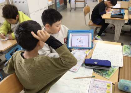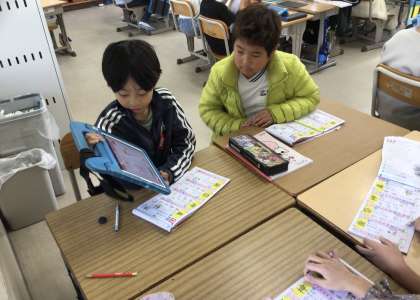 3年2組さん、タブレットも使って、漢字の勉強をグループでしていました。