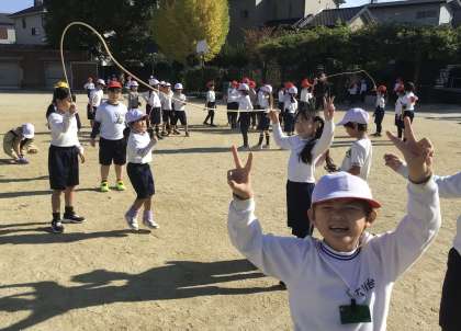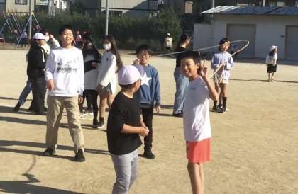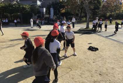 温かい天気の中、運動場では多くの子が遊んでいました。