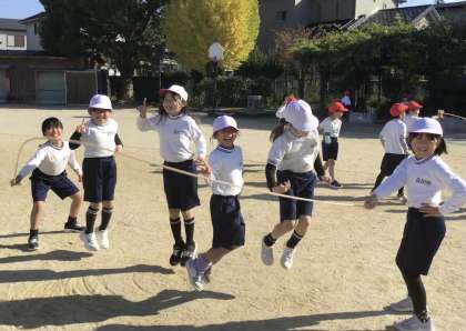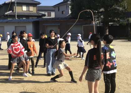 2年生の女の子、4人で連続跳びの真っ最中です。