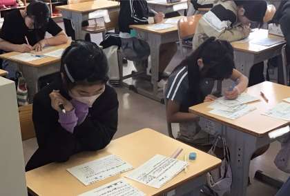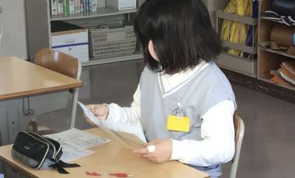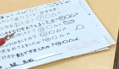 5年1組さんでは全校から集まった避難訓練の振り返り、一枚一枚に朱書きでコメントを書いていました。様子を見ていると、