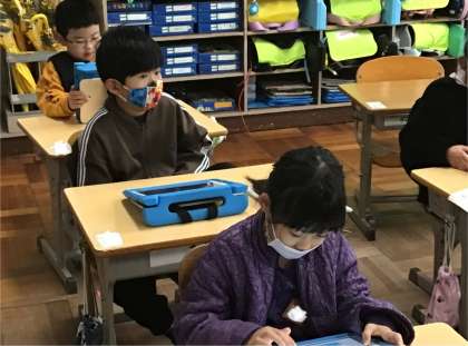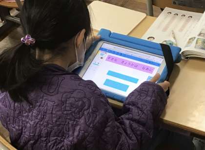 「すきな きょうかは なあに」ということで、タブレットのパワーポイントで1シートごとに自分のすきな教科をまとめます。