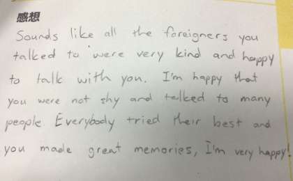 きっとあなたと話し、外国人のみなさんは楽しかったでしょうし、すごく親切に話しかけてくれたでしょうね。みんな、恥ずかしがらずにたくさんの人と話せたようで嬉しかったです。みんな頑張って、素敵な思い出が作れたようで、本当に嬉しいです