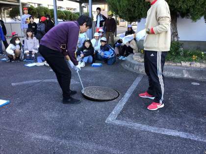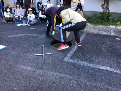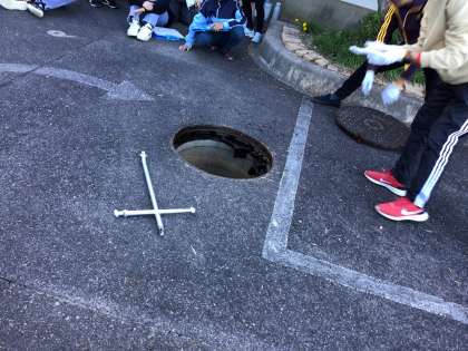 まずは工具を使って、先生たちでマンホールを撤去しました。