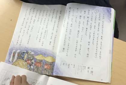 2年1組さん、国語の授業で「かさこじぞう」の3場面を勉強していました。