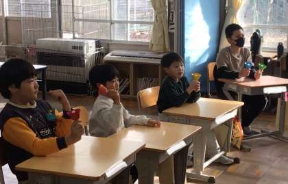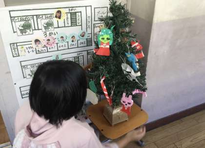 クリスマスツリーに自分たちで作ったものを飾りつけたり、ハンドベルの演奏をみんなでやったり、ふわふわ言葉、ちくちく言葉の勉強をしたりしていました。