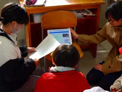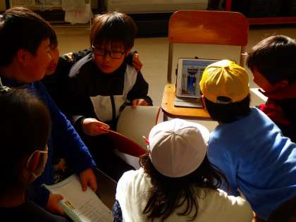 Cくんが再現してくれる画面を2人がのぞき込みます。