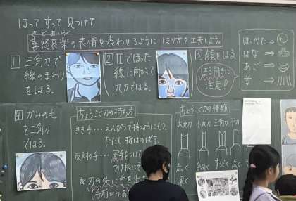 練習を終えた子たちは、自分の顔を下書きしたものに彫刻刀をあてていきます。