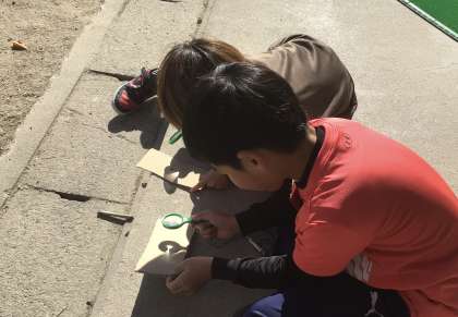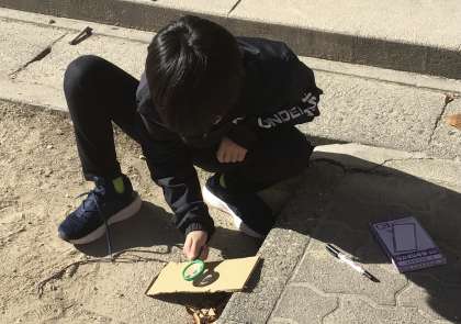 3年1組さん、外に出て虫眼鏡🔍を使った実験です。