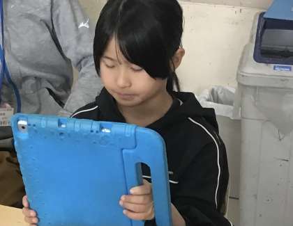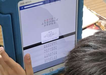 タブレットのアプリを使って、「上の句」を見て「下の句」が言えるか確認していました。
