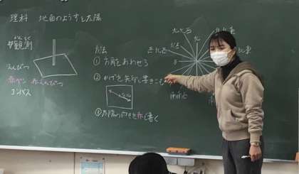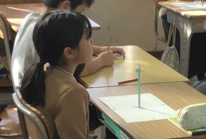 3年2組さん、風の強い中ですが、運動場に出て太陽の方位を確認してきました.