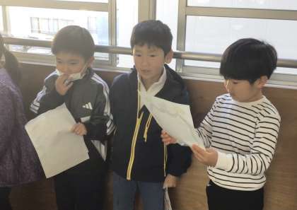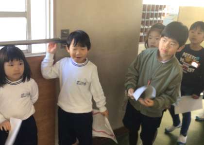 1年生のみんながお手紙を持って、廊下に到着しました.