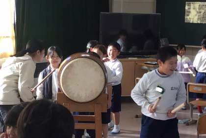 2年生 音楽の授業です 公開日 2025/12/15 更新日 2025/12/15 校長室から 2年2組さん、音楽の授業です. 太鼓をバチを使って叩いていました. 太鼓は残念ながら1つしかないので、交代交代で使います.