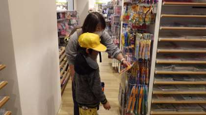 いろいろな物がある(子どもたちの目の高さのあたり、上、下、商品でいっぱいです)ので、どれにするか悩みますが、予算が決まっているので、その中で自分の気持ちに折り合いをつけていくことも勉強しています。
