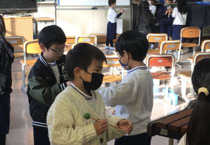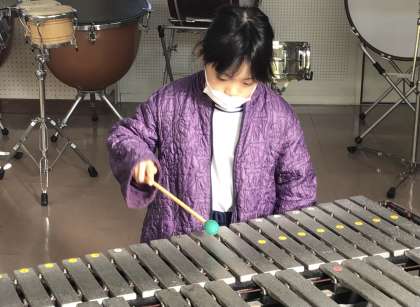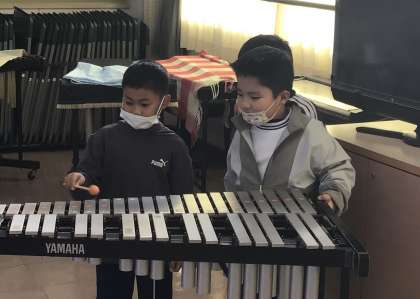 1年1組さん、音楽の授業で木琴、鉄琴、トライアングルの練習です。
