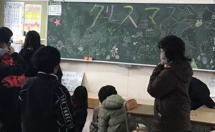 4年生 朝の様子です 公開日 2025/12/23 更新日 2025/12/23 校長室から 4年1組さん、今日はクリスマス会をやるみたいです。 黒板いっぱいに絵が描かれていました。 そして、みんなで目標を話していました。 3年生の子たちも今朝「今日は集会、レク、レク、集会なんだよ」「最高だよね」と言いながら登校していきました。