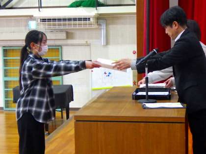 表彰、校長の話、生徒指導主事の話を聴きました。