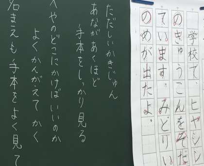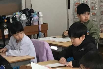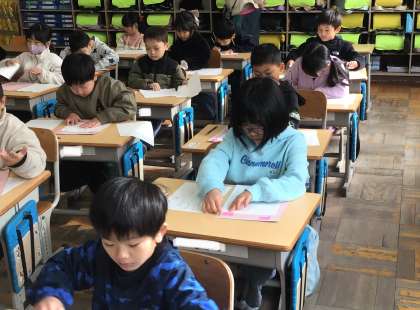 1年1組さん、紙が配られ、書く準備を始めていました。