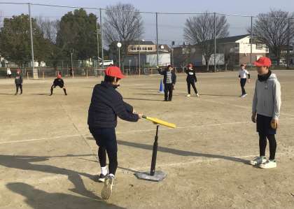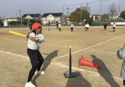 6年2組さん、体育の授業でソフトボールの練習です。