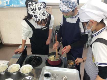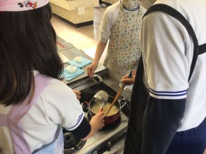 しばらくして5年2組さんの調理実習の様子を見に行くと、すでに味噌汁に味噌を溶かし入れているところでした。