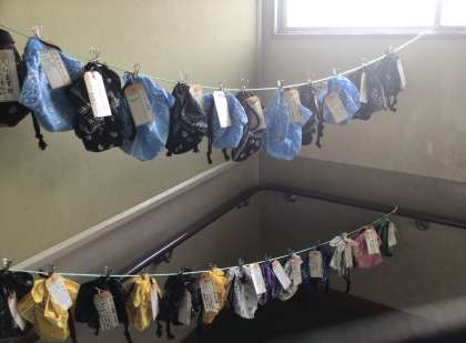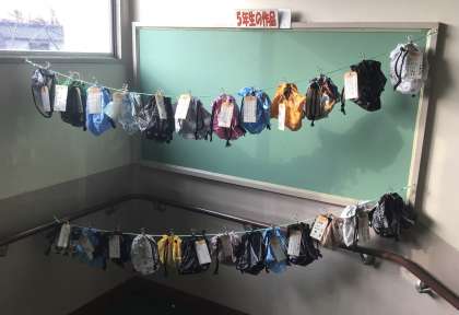 階段の踊り場に5年生のみんなが家庭科の授業で作った「きんちゃく袋」が掲示されていました。