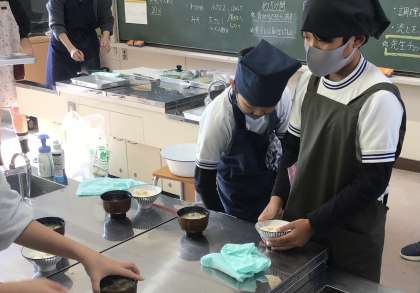 2組さんの味噌汁は「にぼし」が入っていましたが、1組さんは「にぼし」を全部取り除いてくれていました。それでも出汁がよく効いていて、抜群の味でした。大根は、あと1分ぐらい煮込んだ方が好みかなと感じました。ご飯はちょうど良い炊き具合、硬さでした。2組さん同様、上手く作ることができましたね。