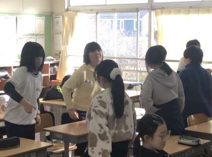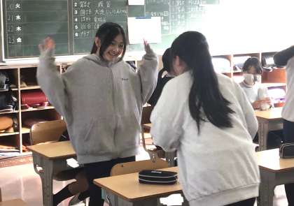 5年1組さん、後ろの席から前の席に「ジェスチャーゲーム」をしていました。