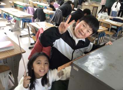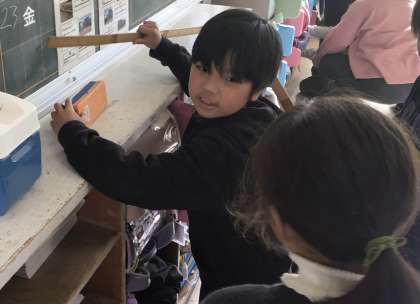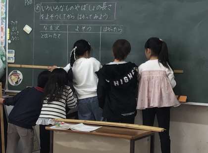 中には黒板の横幅を測ろうと何人かで協力している様子も見られました。