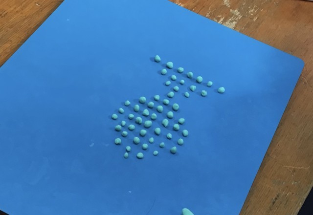 3年2組さん、版画です。多くの子が作り終わったみたいで粘土を使って楽しんでいました。
